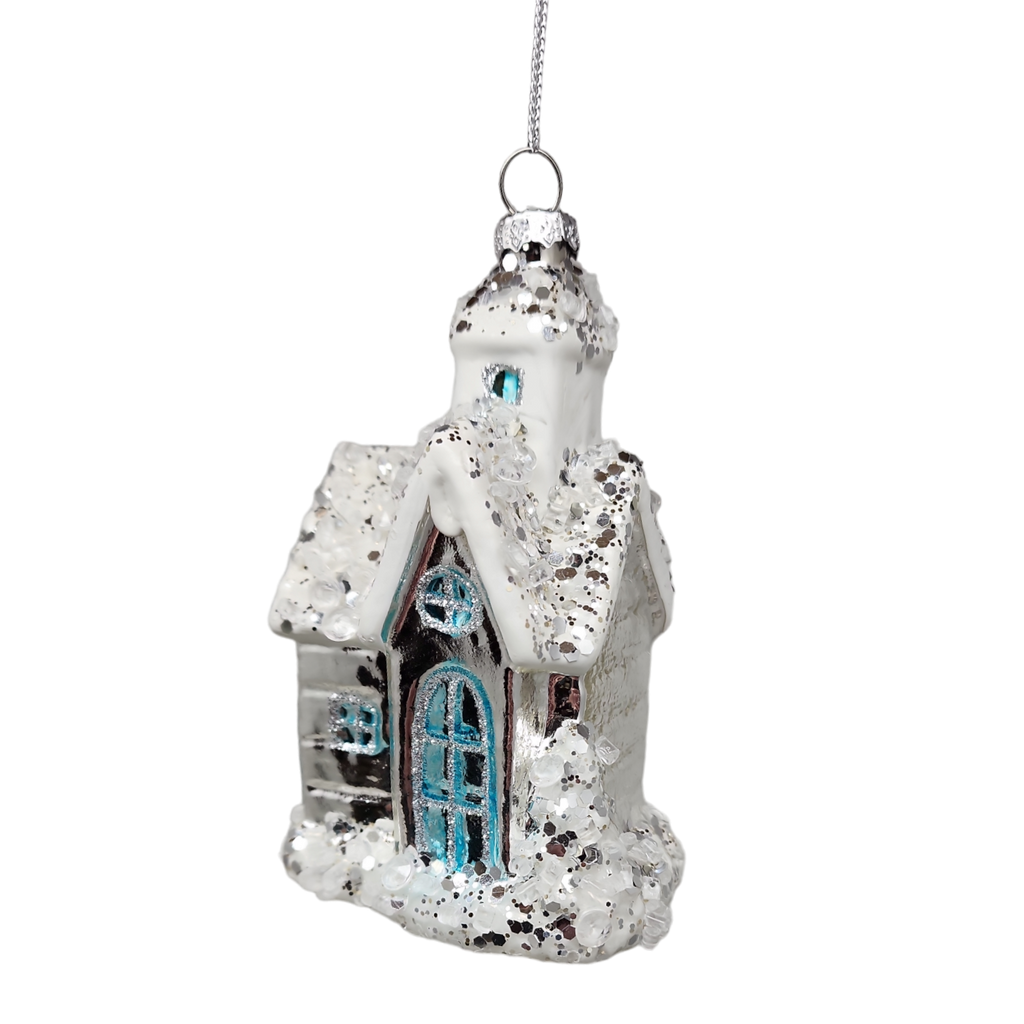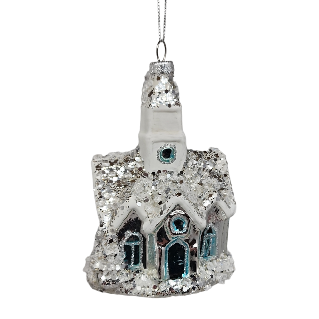 A whimsical multicolor glass church with glittered snow trim, and colorful sprinkles