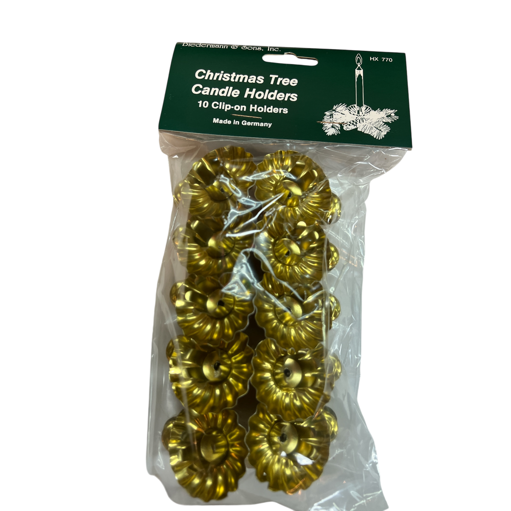 Add a touch of elegance to your holiday decor with our exquisite set of 10 Gold Clip-On Christmas Tree Candle Holders! Designed specifically for securely holding real candles on your tree, these candle holders beautifully blend festive tradition with safety and style. Made in Germany, they offer quality craftsmanship that will enhance the enchanting ambiance of your holiday celebrations. As the soft glow of candlelight flickers through the branches, you'll create a warm and inviting atmosphere that is perfect for family gatherings and cherished memories.