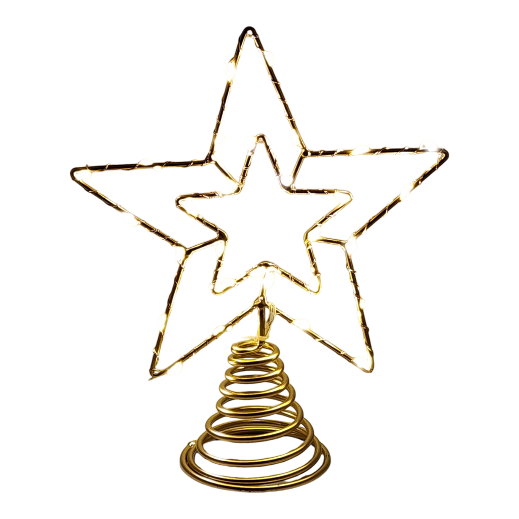 Elevate your holiday decor with the stunning Gold Star Tree Topper, a charming accent that brings warmth and elegance to your Christmas tree. Standing proudly at over 9 inches tall, this enchanting piece is crafted with a beautiful gold wire design and adorned with 30 warm white lights that create a soft, inviting glow. Perfect for adding a touch of sophistication, it effortlessly complements any festive theme while drawing attention to the top of your tree.
