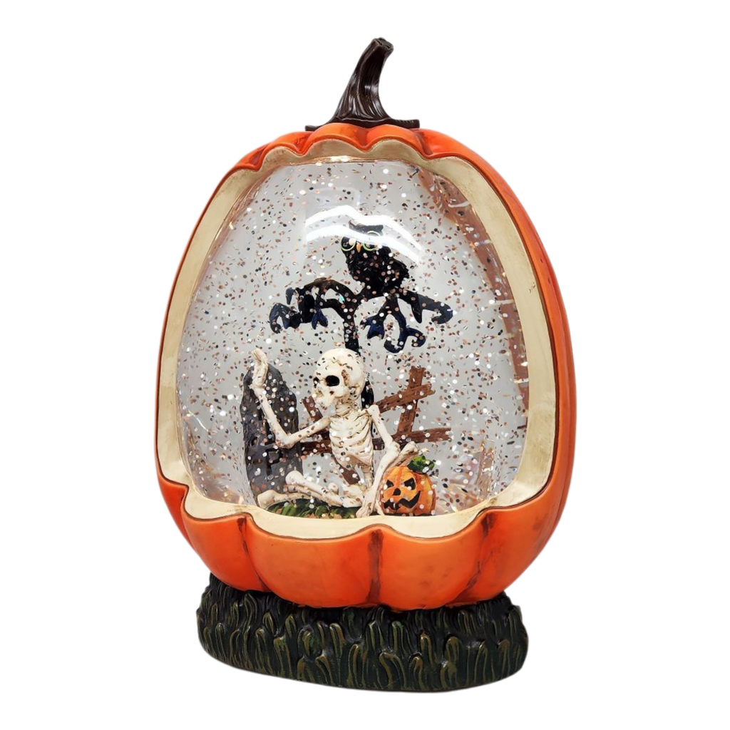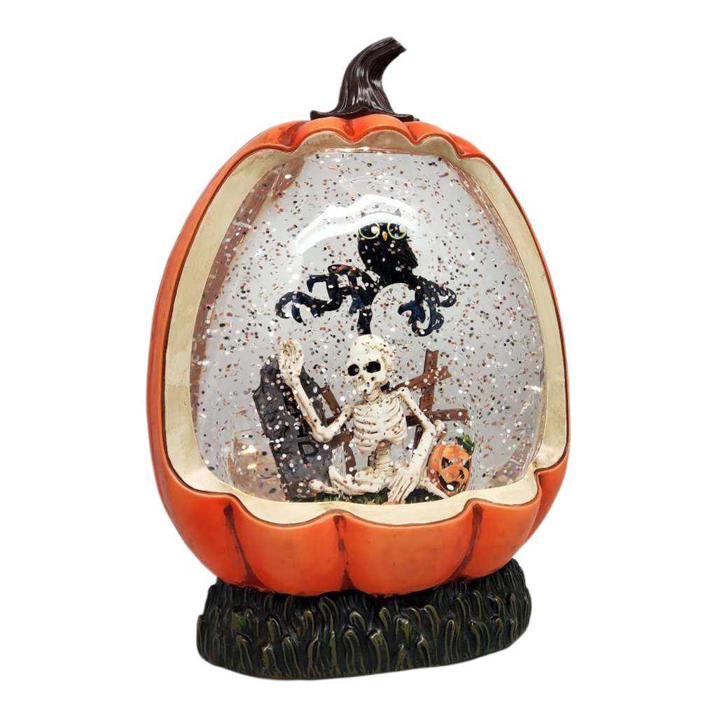 Ideal for adornment on tabletops, mantels, or as a centerpiece during Halloween gatherings, the Spooky Skeleton Pumpkin Water Globe is sure to capture the attention and hearts of everyone. With its playful design and enchanting shimmer, it invites joy and conversation into your festive celebrations, making it a beloved piece to display for years to come!