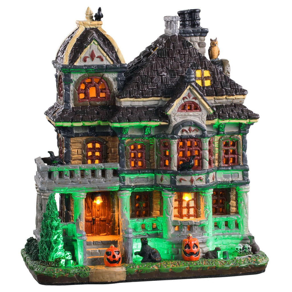 The Haunted House is meticulously crafted and hand-painted with rich, dark colors and detailed textures. It features iconic elements such as carved pumpkins, lurking black cats, and perched ravens, all of which add to its eerie ambiance. Tiny details like the cobwebs, an owl resting on the roof, and intricate window designs bring the piece to life, making it a standout addition.