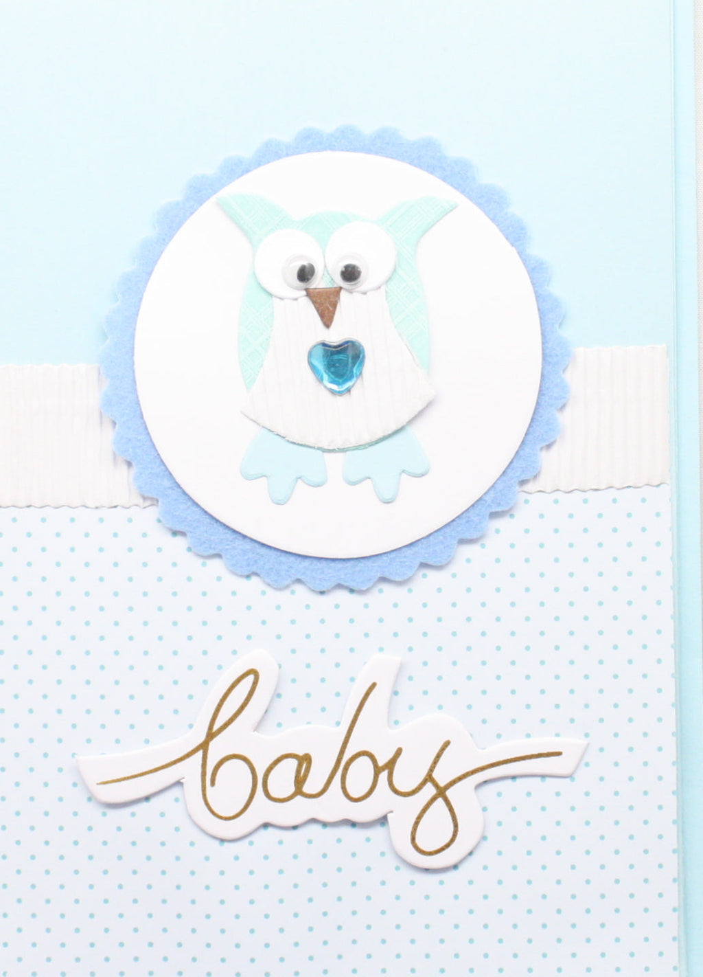 Welcome the newest addition to your family with this handmade embellished welcome baby card! Featuring a blue owl on the front, this 6 3/4" x 4 3/4" card is sure to make a statement. Inside is blank for you to add your own personalized message. It's made with love using cutouts, ribbons and beads - perfect for celebrating the arrival of a special little one.
