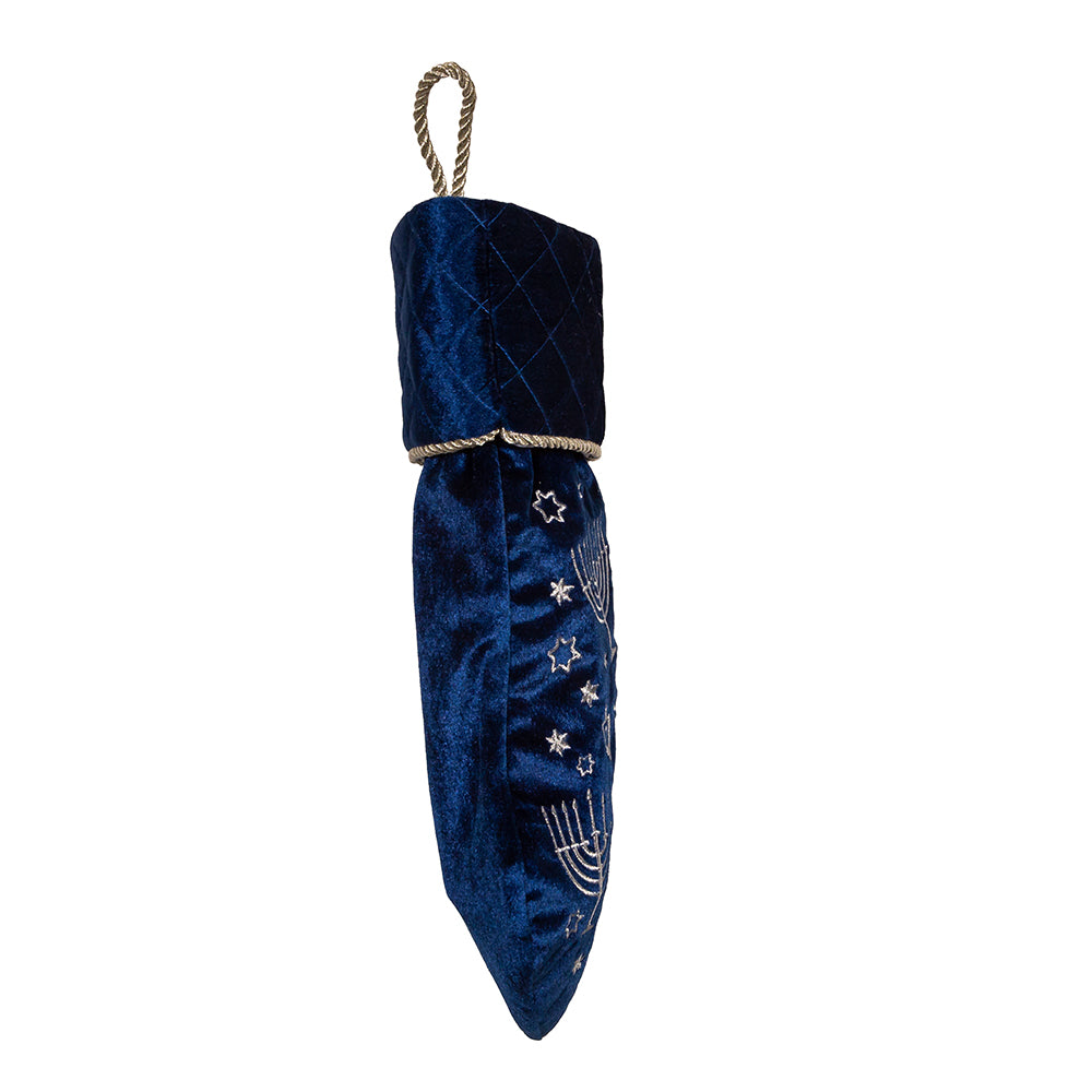 Kurt Adler's Hanukkah stocking is a festive addition to any home or office holiday décor. It features Menorah's, silver stars and Dreidels on a plush blue stocking with a blue quilted cuff and silver rope details.