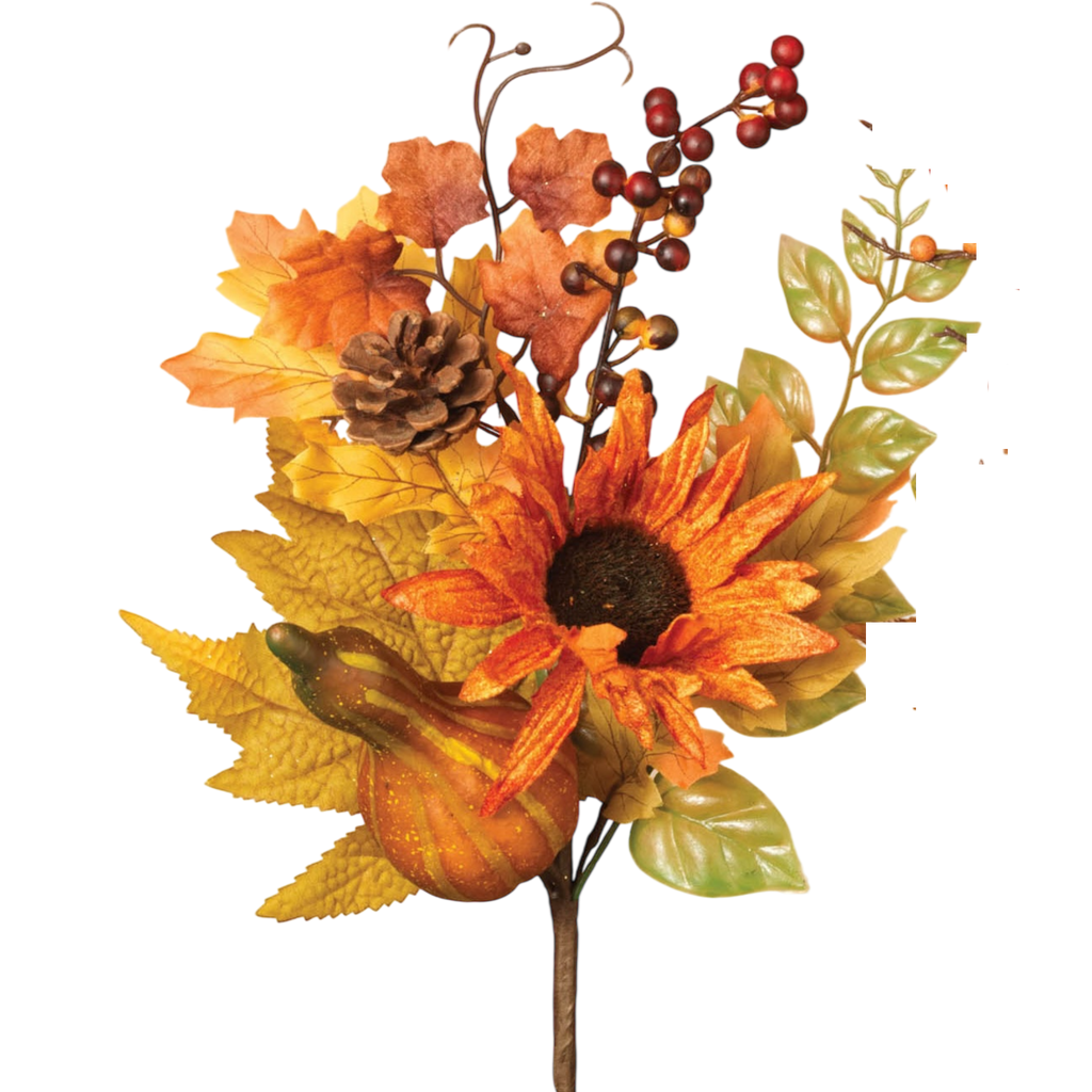 14 inch tall Harvest Picks with orange sunflowers and yellow gourds and leafs are perfect to accent your table or room.