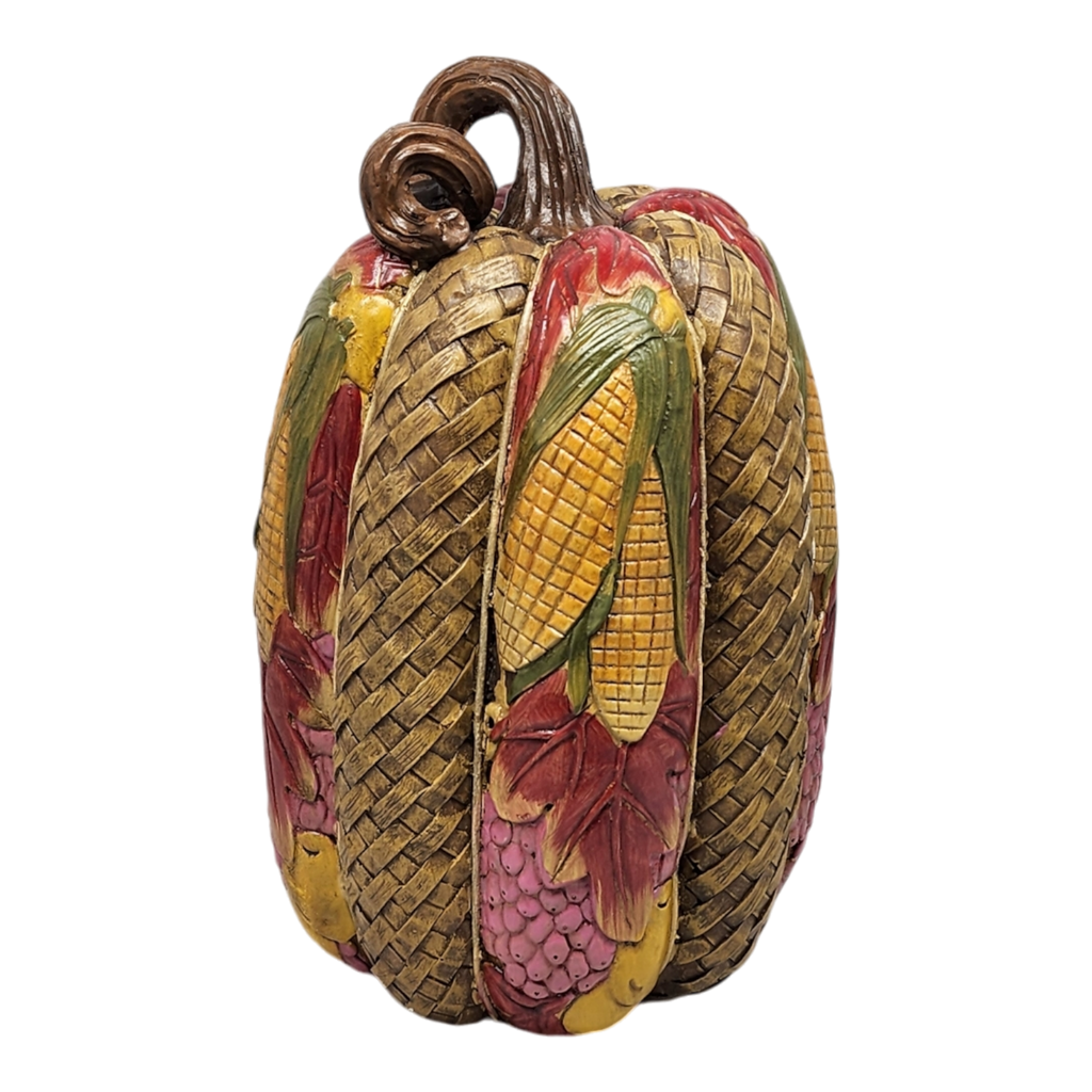 Each pumpkin, sold separately, showcases different harvest elements such as corn, pumpkins, grapes, and wheat, all richly painted in warm, earthy tones. The realistic design and fine craftsmanship make these decorative pieces perfect for complementing your mantel, table centerpiece, or entryway. Celebrate the harvest season with these elegant resin pumpkins, a timeless addition that embodies the beauty and abundance of fall.