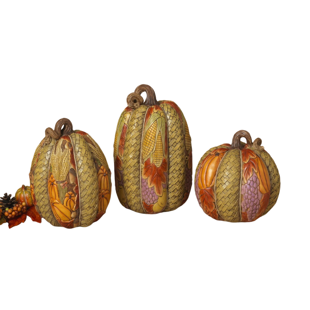 Bring the rustic charm of autumn into your home with these beautifully crafted Resin Harvest Pumpkins. Ranging from 8" to 11" tall, each pumpkin is meticulously designed with intricate details that celebrate the bounty of the fall season. Featuring textured surfaces that mimic woven baskets and adorned with vibrant images of seasonal fruits, vegetables, and grains, these pumpkins are a stunning addition to any autumn display.