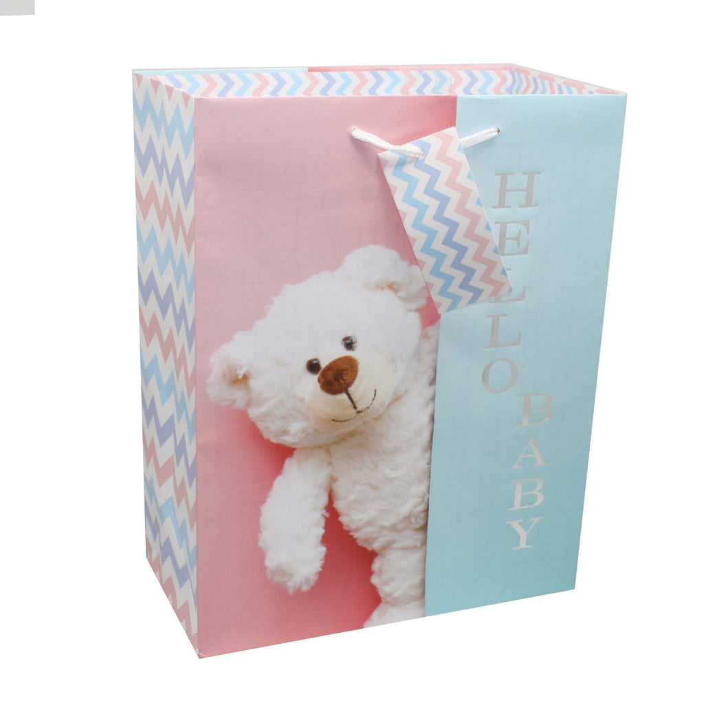 Welcome baby with this Hello Baby pink and blue Gift Bag with coordinating gift tag