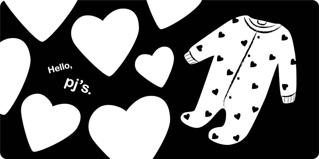 A charming high-contrast introduction to bedtime. Black-and-white patterns and illustrations pair with friendly greetings for favorite pjs, a teddy bear, a comfy pillow, and more.