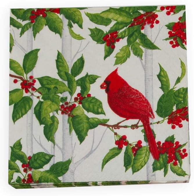 Bring the beauty of nature to your holiday gatherings with our Holly And Songbirds Cocktail Napkins! This exquisite package includes 20 high-quality 3-ply napkins featuring a vivid illustration of a striking red cardinal perched on a branch dotted with holly berries and lush green leaves. The charming design set against a white background adds a fresh and festive touch to your table, making these napkins perfect for Christmas celebrations, winter parties, or cozy get-togethers. Measuring 5 inches square when folded and opening to a generous 10 inches, they are ideal for serving cocktails, appetizers, or delightful desserts.