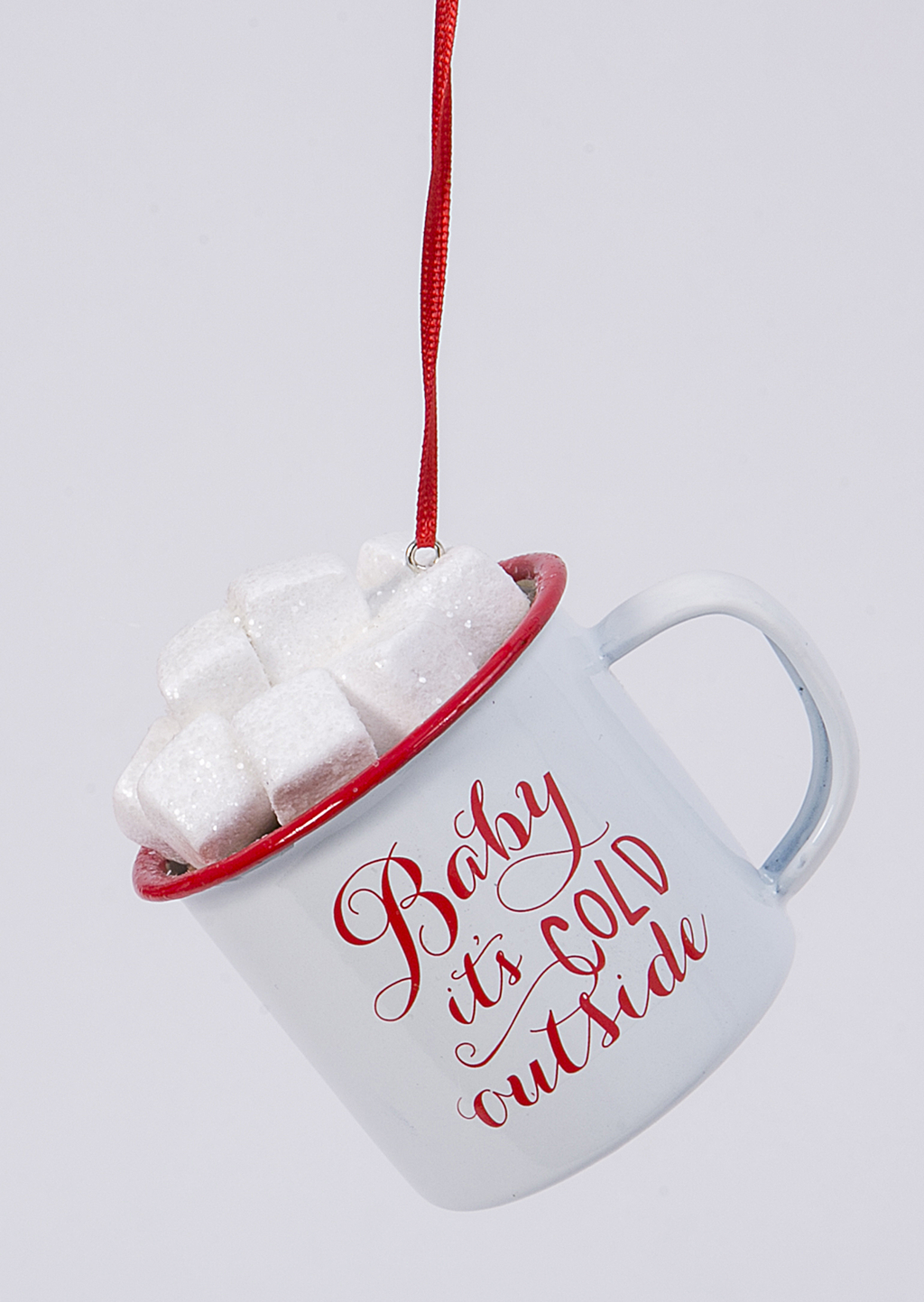 Cozy up your Christmas tree with our delightful Hot Cocoa Mug Ornament! Measuring just over 3 inches tall, this adorable decoration features a charming metal cup filled with realistic polyresin marshmallows, all topped with a festive red rim. Emblazoned with the phrase "Baby it's Cold Outside," it perfectly captures the essence of those snug winter nights spent sipping hot chocolate by the fire.