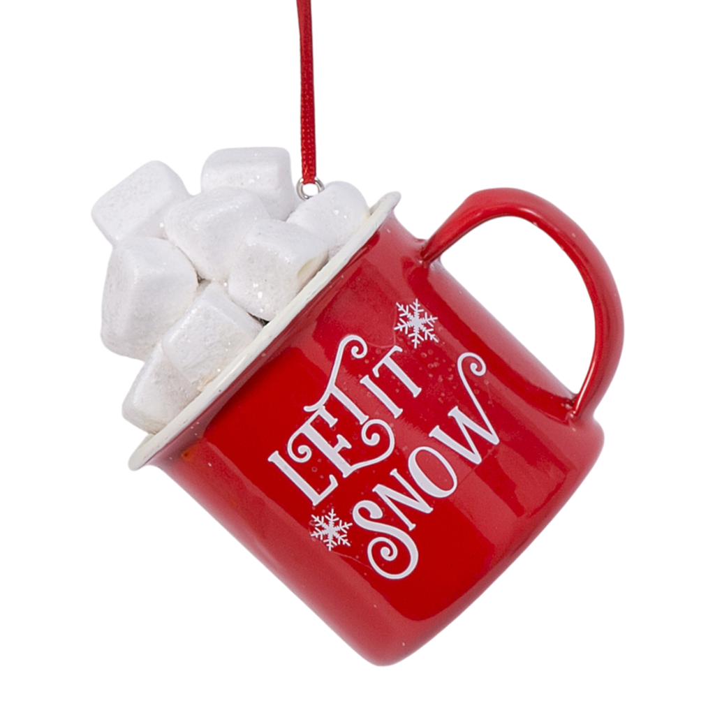 Add a sprinkle of holiday magic to your tree with our charming Hot Cocoa Mug Ornament! Just over 3 inches tall, this festive decoration showcases a vibrant red metal cup brimming with lifelike polyresin marshmallows, all topped with a sparkling dusting of "snow." The cup features the joyous phrase "Let it Snow," inviting the warmth and wonder of the season into your home, even if the weather outside is frightful.
