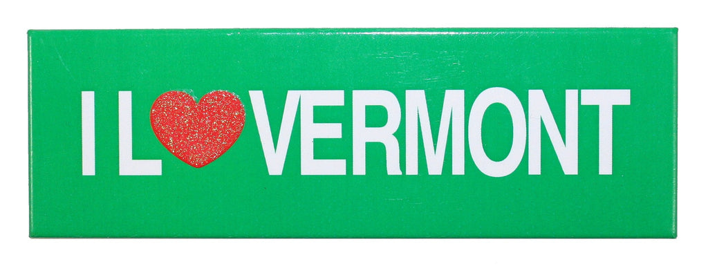 Magnetic 'I love Vermont' sign with glittering red heart.