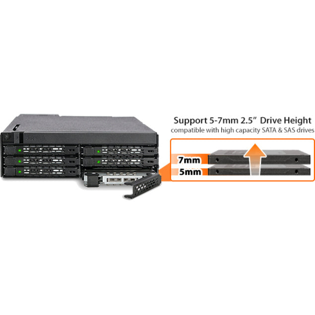 MB606SPO-B's tray is designed to support HDDs and SSDs up to 7mm in height, making them compatible with SAS drives as well as SATA drives. SAS drives are used in enterprise applications such as long-term archival for their long lifespan and higher reliability