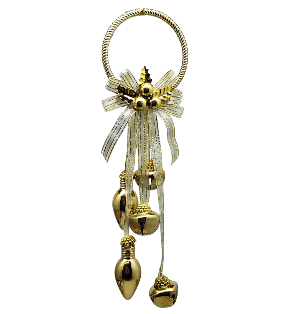 Elevate your holiday décor with our elegant Golden Jingle Bell Door Hanger! This stunning piece features a luxurious gold finish, bringing a touch of sophistication to your entryway while embodying the festive spirit of the season. The 3.25-inch diameter door knob ring is beautifully adorned with a stylish ribbon and a charming arrangement of three working jingle bells, accompanied by two decorative ornament dangles that add flair and shine. It’s the perfect way to greet family and friends with a festive welcome!