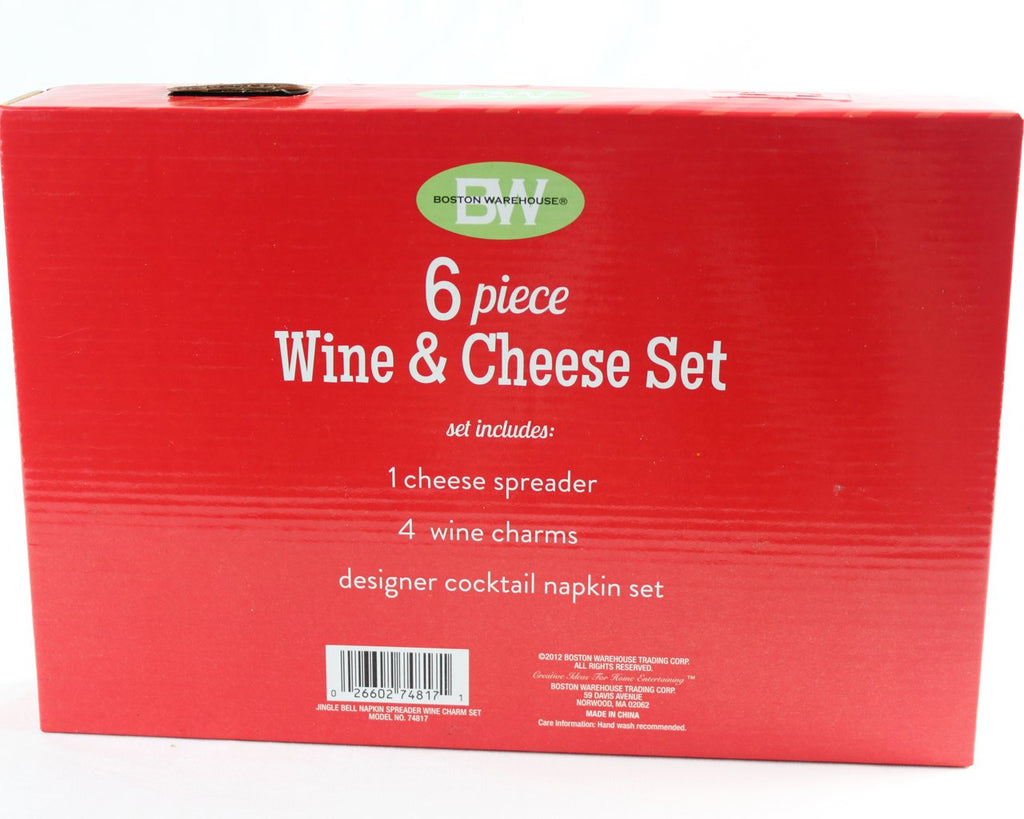 This set includes a Festive Glass Handle Cheese spreader, 4 Wine Charms (to establish Glass Ownership), each with a distinctive Jingle Bell, and a package of designer cocktail napkins.
