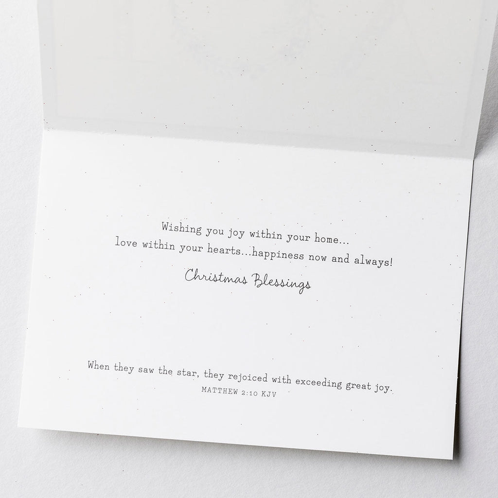 Send Christmas blessings to family and friends with our 'Joy' Christmas greeting cards, featuring a timeless Scripture from the King James Bible, a heartfelt Christmas message, and a meaningful manger design.