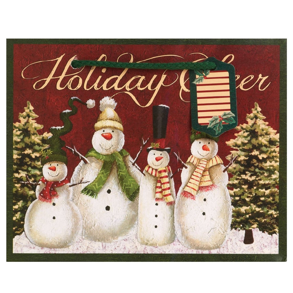 Large Gift Bag Snowman. Spend more time enjoying the holidays and less time wrapping with Jillson Roberts gift bags! The bags measure a very generous 17-1/2 x 14 x 7 Inches, making them a must-have for quickly wrapping large or awkwardly-shaped gifts. Each Jillson Roberts recycled gift bag is made from 100% recycled content which contains 30% post-consumer fiber that is chlorine free using non-toxic bleach. The bags are printed using water-based non-toxic inks and are coated with a special non-toxic UV varnish. All Jillson Roberts gift bags have folded upper edges for added durability and color-coordinated cord or ribbon handles with attached matching die-cut gift tags.