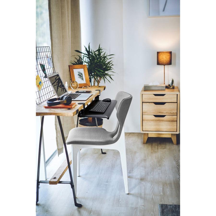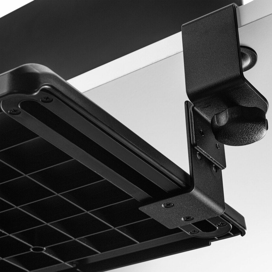 Sturdy, Easy-to-Install Metal Clamps No tools or installation expense required, installs in minutes. Fits desks up to 1.5' (4 cm) thick for solid, stable comfort. Smooth-Moving Rail with Ample Clearance Accommodates everything from slim to mechanical and gaming keyboards, as well as standard mice, vertical mice, and trackballs. Eliminates the need to mount a slider under the desktop. Won’t Damage Desk Surface C-clamp design won’t damage or mark desk or table. SmartFit® Enabled Makes finding the right height adjustment for maximum comfort as easy as 1-2-3. Simply match your hand size to the color on the provided chart, set the height to your color, and you’re done. TAA-Compliant Supports U.S. Federal Government purchasing protocols. Create a more comfortable typing position for wrists and forearms, save space, and keep your work area clutter-free quickly and easily with the SmartFit® Clamp-On Keyboard Drawer. It installs in minutes without tools, and won’t damage the surface. SmartFit® makes finding the right height adjustment for maximum comfort as easy as 1-2-3. Save time and installation (and uninstallation) expense by using sturdy metal clamps that fit desks and table tops up to 1.5' (4 cm) thick. Sturdy, easy-to-install metal clamps require no tools or installation expense, and install in minutes. Fits desks up to 1.5' (4 cm) thick for solid, stable comfort. Smooth-moving rail with ample clearance accommodates everything from slim to mechanical to gaming keyboards, standard and vertical mice, and trackballs. No need to mount a slider under the desk. C-clamp design won’t damage or mark desk or table surface. With SmartFit®, finding the right height for maximum comfort is as easy as 1-2-3. Simply match your hand size to the color on the provided chart, set the height to your color, and you’re done. TAA-compliant, so it supports U.S. Federal Government purchasing protocols.