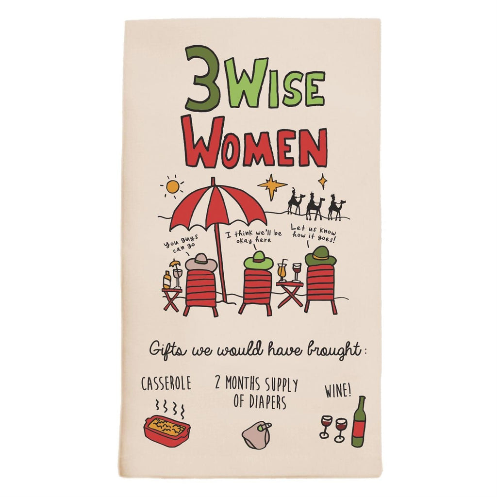 Bring some kitchen fun to your Christmas dinners with this 3 Wise Women Tea Towel! This towel features 3 women relaxing on the beach and what they would have brought including casserole, diapers and wine.