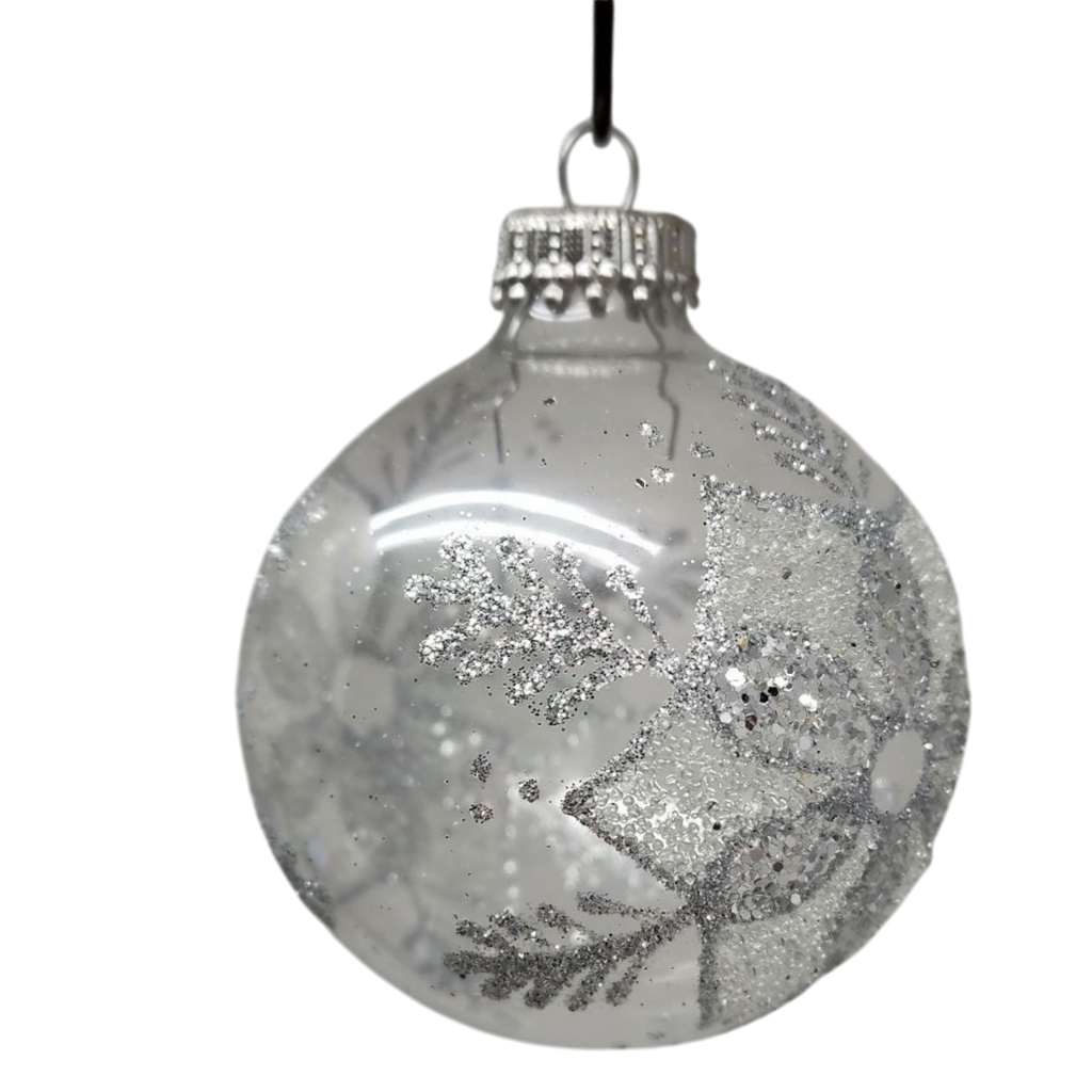 Add a touch of winter elegance to your holiday décor with our beautiful set of four glass ball ornaments, featuring a stunning design that showcases a delicate "Frosted Poinsettia" pattern. Each ornament measures just over 2.5 inches in diameter and features a clear base embellished with silver glitter and sparkling accents, beautifully depicting frosty poinsettia flowers and whimsical snowflakes.