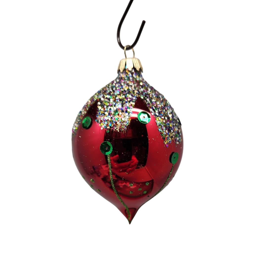 Add a touch of glamour to your holiday celebrations with our exquisite set of four red glass drop ornaments! Each ornament showcases a striking design, complete with eye-catching glitter accents and shimmering sequins that catch the light beautifully. The unique shape reminiscent of traditional Christmas ornaments measures just over 4 inches in length, making them a stunning focal point for your Christmas tree or festive displays.