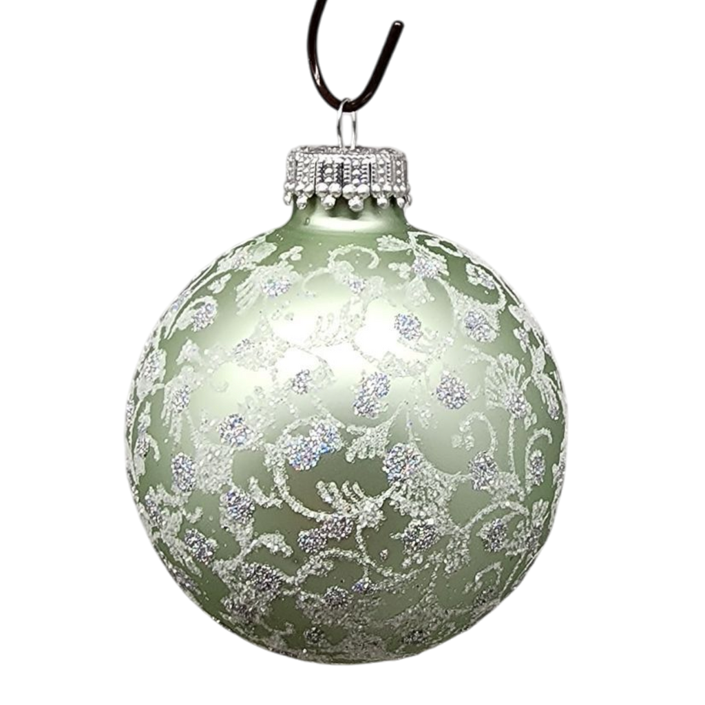 Immerse your holiday decor in the tranquility of nature with our "Serene Green" ornament set! Featuring a soft green hue, these beautiful ornaments are adorned with intricate white floral patterns and shimmering detailing that captures the eye and evokes the essence of a gentle, winter wonderland. Each ornament measures approximately 3 inches in diameter, making them perfect for adding a touch of elegance and charm to your Christmas tree or festive displays.