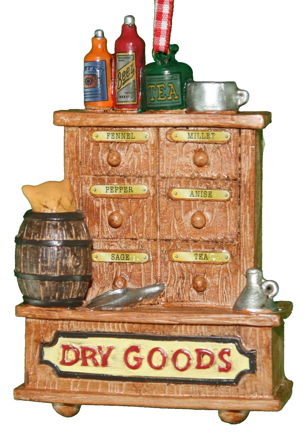 Step back in time with our delightful Vintage Dry Goods Store Ornament! Standing at approximately 3.5 inches tall, this charming piece features an intricately detailed representation of an old-fashioned general store, complete with rustic drawers labeled for various spices and dry goods. The careful hand-painted design highlights the unique character of this ornament, making it a wonderful addition to your holiday decor or a nostalgic gift for someone who cherishes bygone eras.