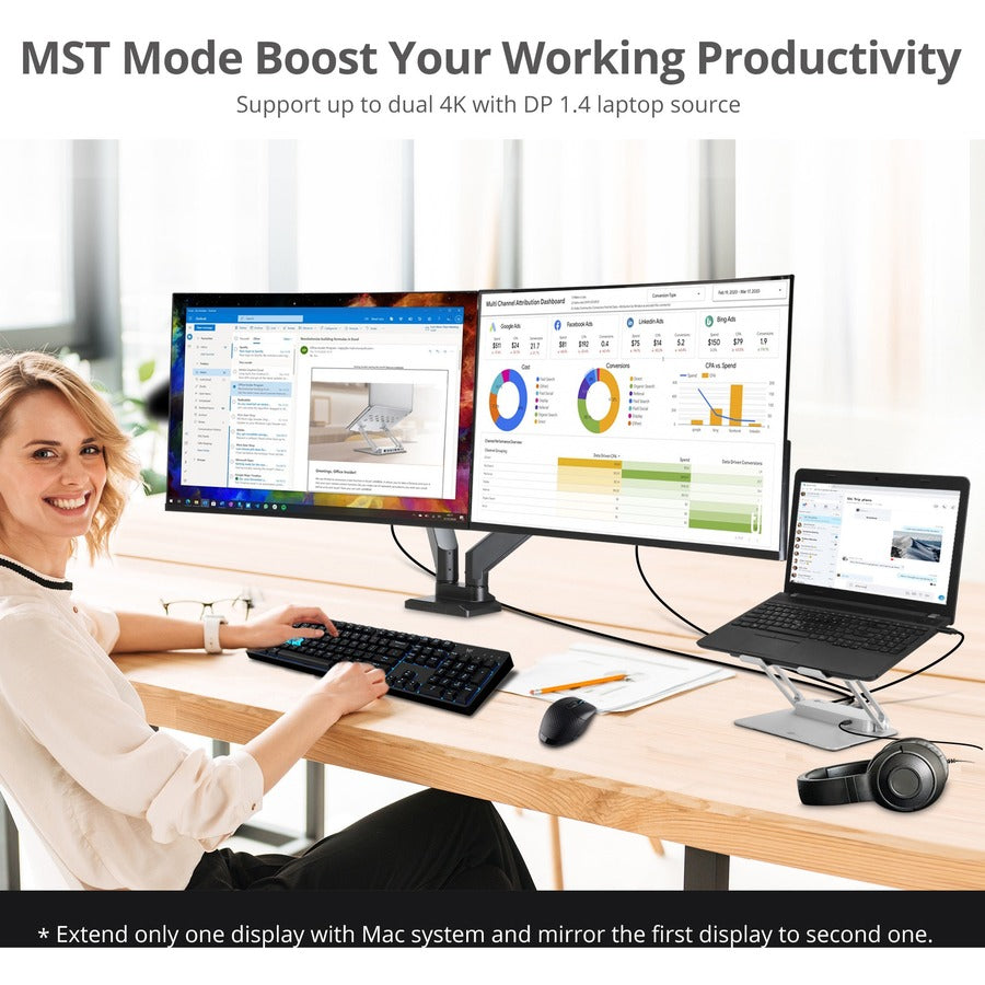 - DisplayPort Multi Stream Transport* (MST) technology supports single screen for 3840x2160 60Hz or dual screen for 3840x2160 30Hz with DP 1.4 laptop source Note: macOS does not support MST function and will only mirror the displays