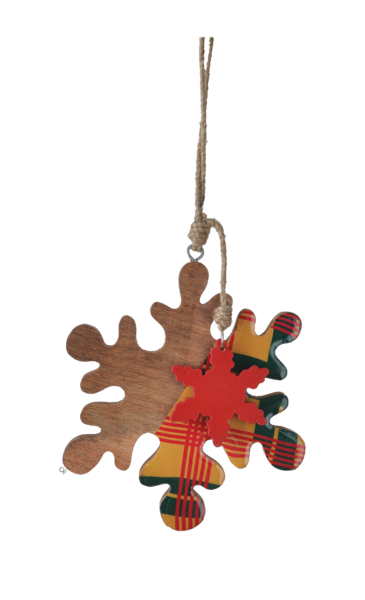 More of a Decoration for a Wall, Door, or accent to a wreath, this Snowflake is a crafted wooden decor item with half the front of teh snowflake covered with a plaid design. An additional smaller wooden snowflake hangs from the Sisal twine rope to add that extra touch.