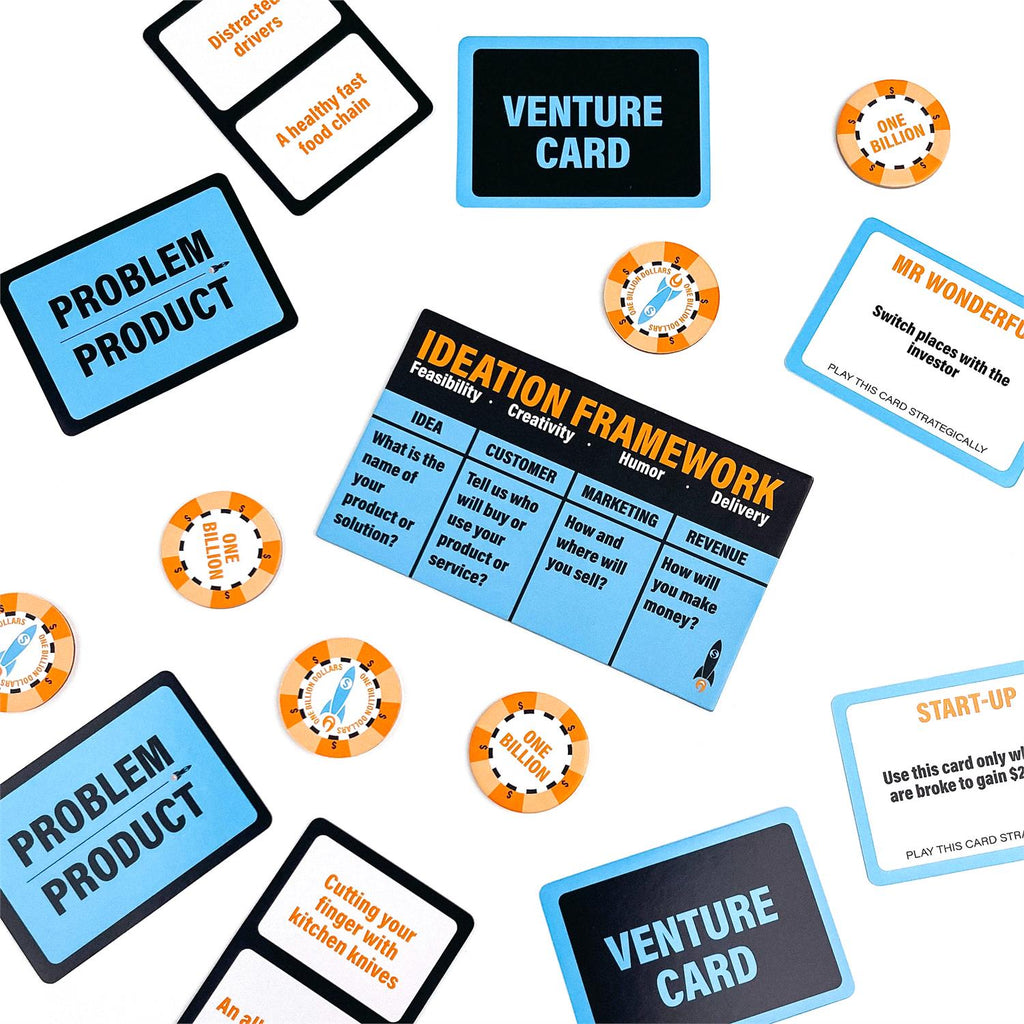 Draw a card to get a problem or product that only you can solve. The investor gives everyone 2 minutes to come up with their best pitch ideas and then pitch it. Whoever comes up with the best new solution or product for their topic gets A BILLION DOLLARS (okay, a billion dollar chip). The player with the most money at the end wins!