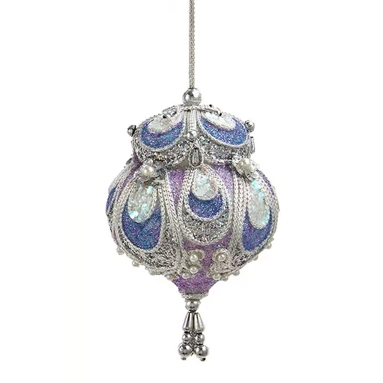 From Kurt Adler this Lavender Satin Fabric ornament with iridescent glittered blue lavender and silver glitter Tornasol Beads with Rayon Cord will Brighten any tree or wreath.