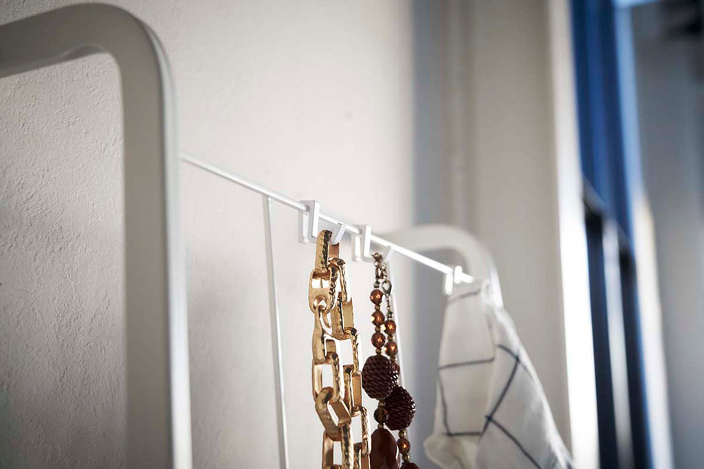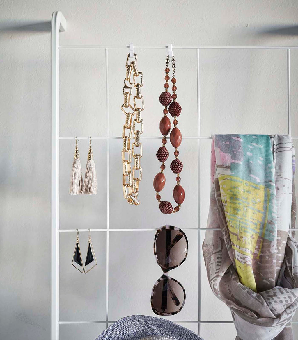 Create cleaner, clutter-slaying habits by making use of convenient catch-all ladder like this one. Make a display out of your favorite hats, scarves, glasses, and more with this useful catch-all grid. When you get home, make it your new habit to throw your accessories onto this space-saving rack rather than countertops, tables, or heaven forbid—the floor.
