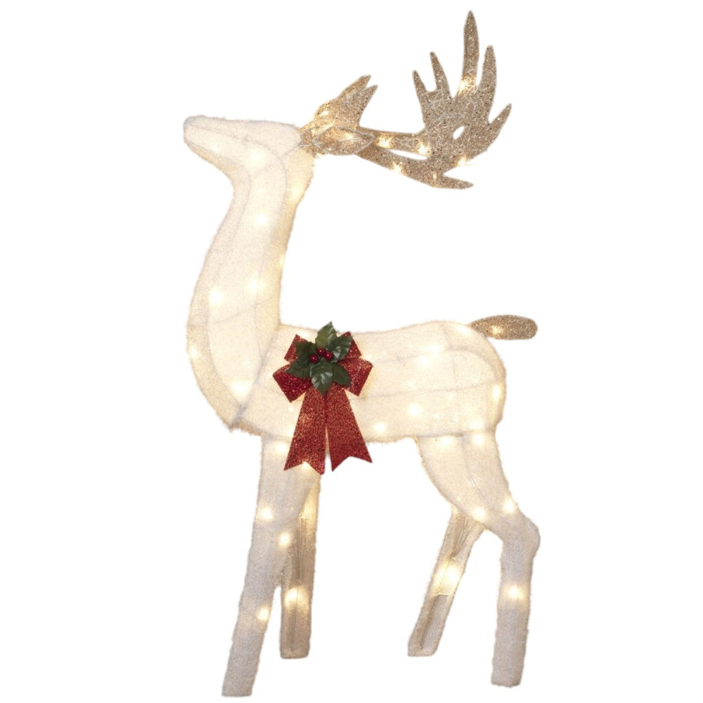 Bring the magic of the season to your home with our enchanting Glittering Frost Reindeer! Standing tall at 48 inches, this stunning holiday decoration is sure to be a showstopper in your festive display. Featuring a soft white finish that mimics pristine snow and adorned with dazzling gold antlers, this charming reindeer is embellished with a vibrant red bow and festive holly, exuding joy and holiday spirit. Designed for both indoor and outdoor use, this beauty will illuminate your space with a warm glow from its LED lights, creating a welcoming atmosphere for family gatherings and holiday parties.