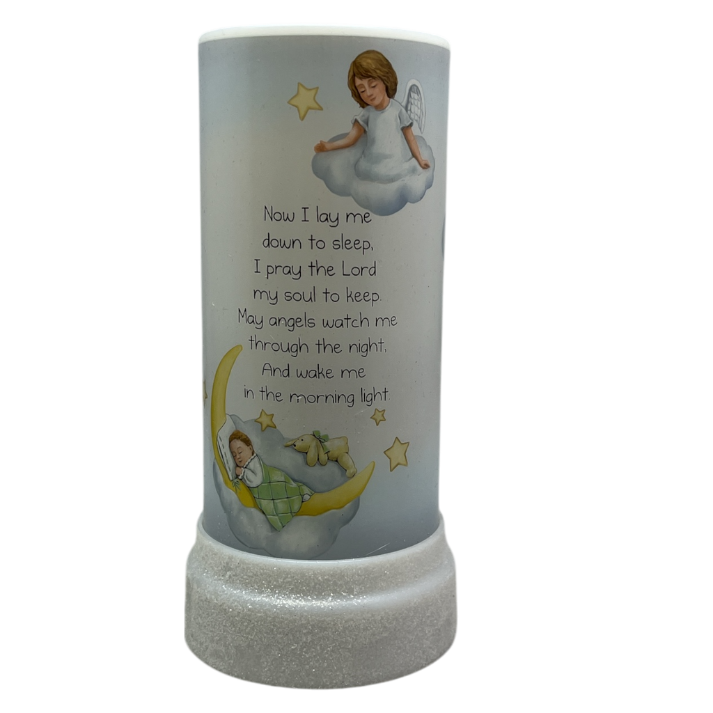 As it projects soft, glowing shapes of stars, a crescent moon, and clouds onto the surrounding walls, the nightlight transforms the room into a serene haven, perfect for encouraging peaceful sleep. The gentle light and comforting imagery evoke a sense of safety and warmth, making it an ideal companion for bedtime routines. This nightlight not only serves a practical purpose but also adds a touch of whimsy and spirituality, reinforcing the comforting bedtime prayer printed on its surface, which speaks to the protective presence of angels during the night.