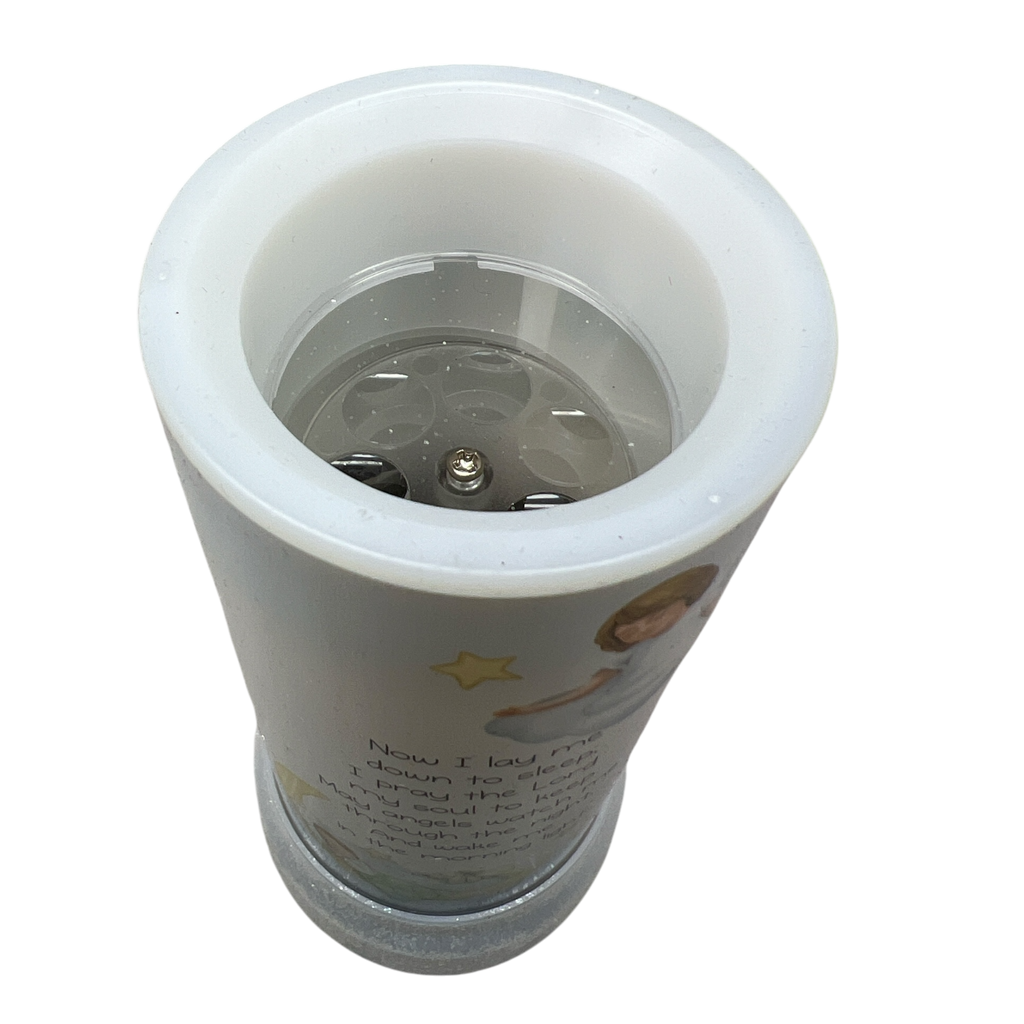 The LED Projector Sweet Dreams Night Light is a charming addition to any child's room, designed to create a soothing and magical atmosphere at bedtime. Standing just over 6.5 inches tall, this nightlight can be powered by three AAA batteries (not included) or a USB power cord, offering flexibility for use in various settings. Its cylindrical shape features a frosted surface adorned with delicate illustrations of angels and a child, enhancing its celestial theme.