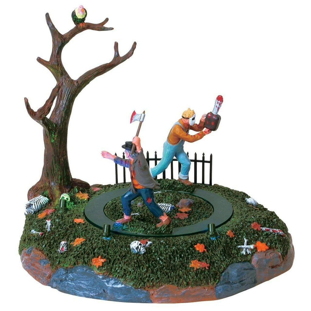 Get ready for a thrilling ride this Halloween with the spine-tingling Slasher Rivals! This dynamic display captures the essence of horror fun as figures of two iconic rivals dash around in a circular motion, each wielding their favorite "weapons" — an axe and a chainsaw! Set against a backdrop of a gnarled tree and scattered autumn leaves, this chilling scene adds a lighthearted yet thrilling element to your Halloween village, perfect for fans of classic horror movies.