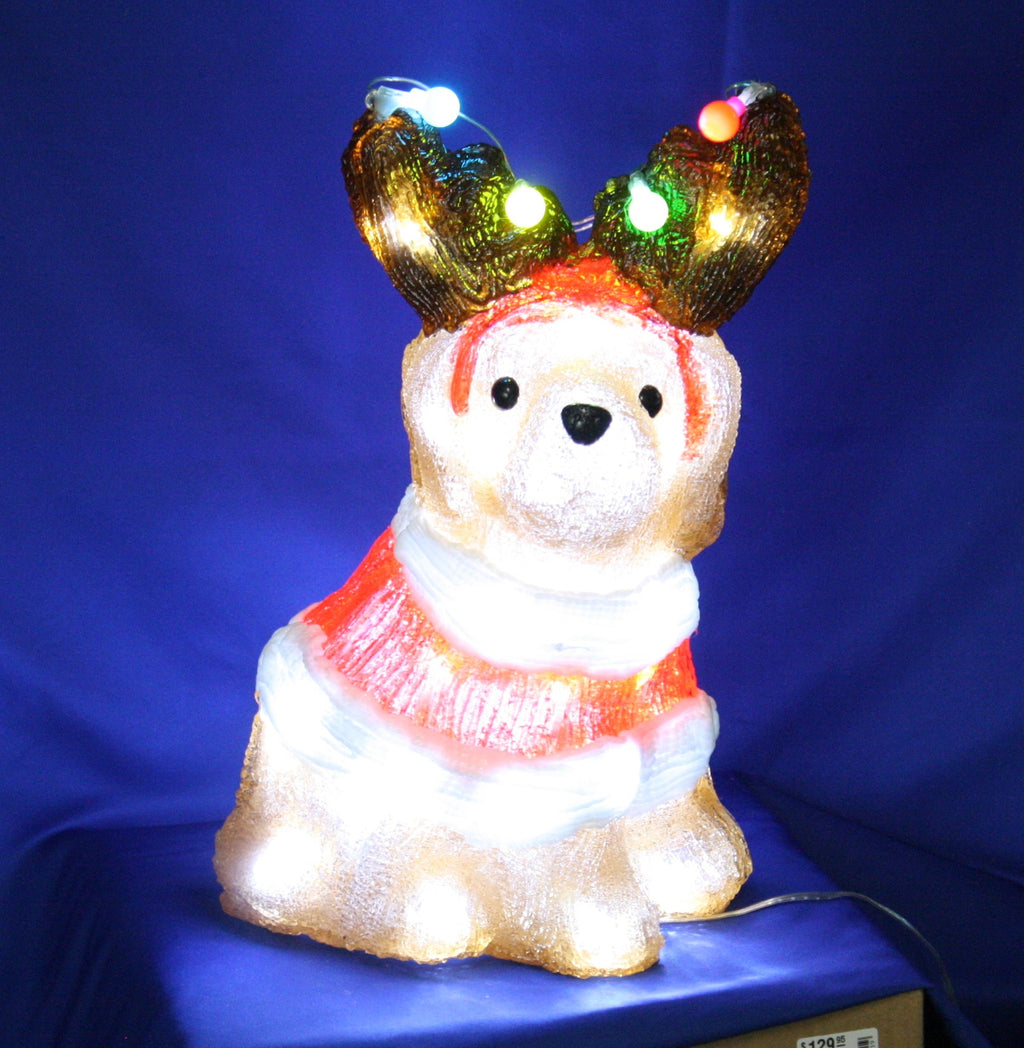Adorable lighted figurine has a 13 inch puppy all decked out for Christmas with his lighted antlers.