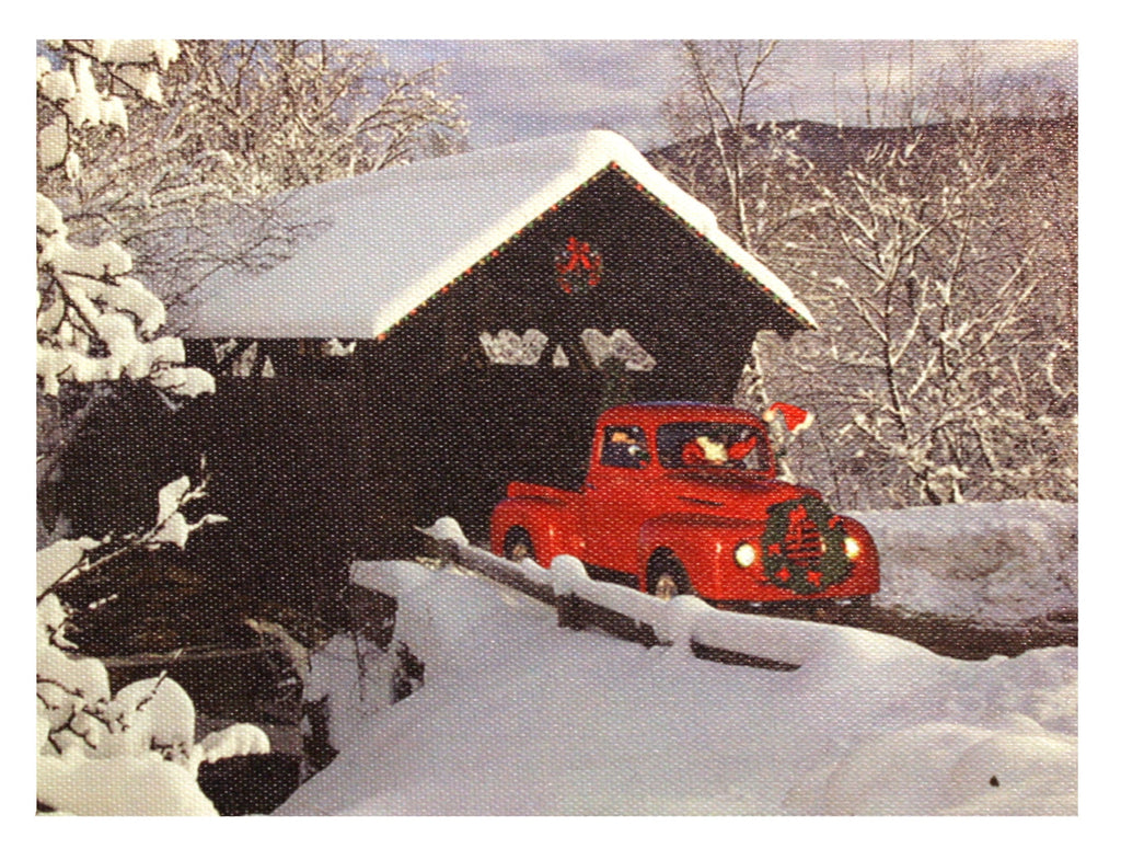 7.8" Lighted Canvas Print - Santa In Red Truck Going Under Covered Bridge