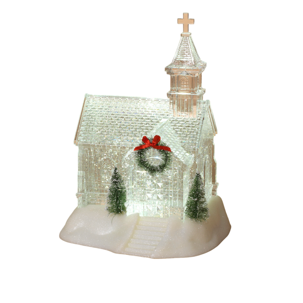 Turn on the switch, and watch the water and glitter swirl while bright LEDs light the Entire Church and water from within.