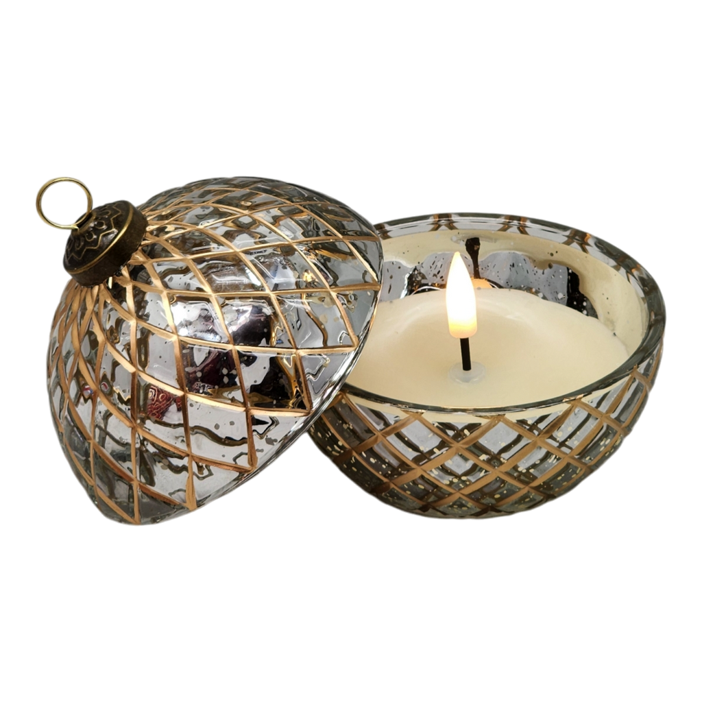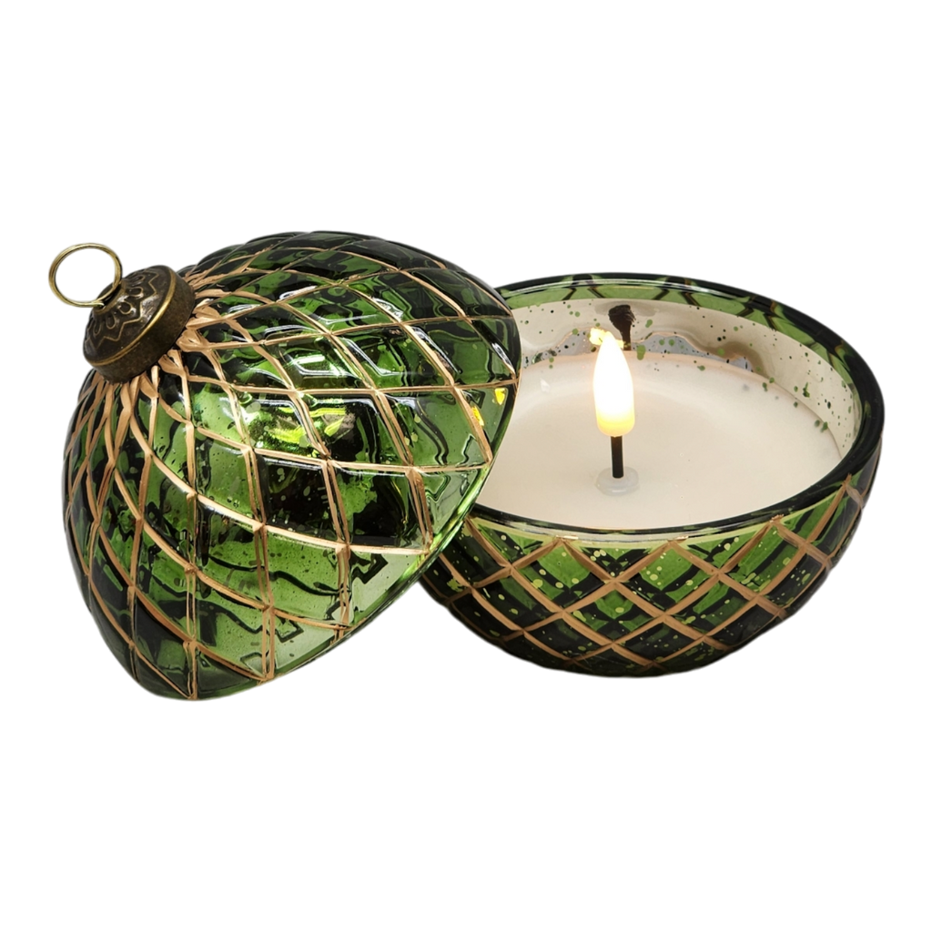 Elevate your holiday ambiance with these exquisite Glass Ornament Candle Holders, blending traditional holiday charm with a touch of elegance. Each glass container, designed to resemble a beautifully patterned ornament, holds a wax candle with an LED wick, creating a realistic flickering flame effect. Available in a variety of rich colors including festive reds, greens, and golds, these candles add a warm, inviting glow to any setting.