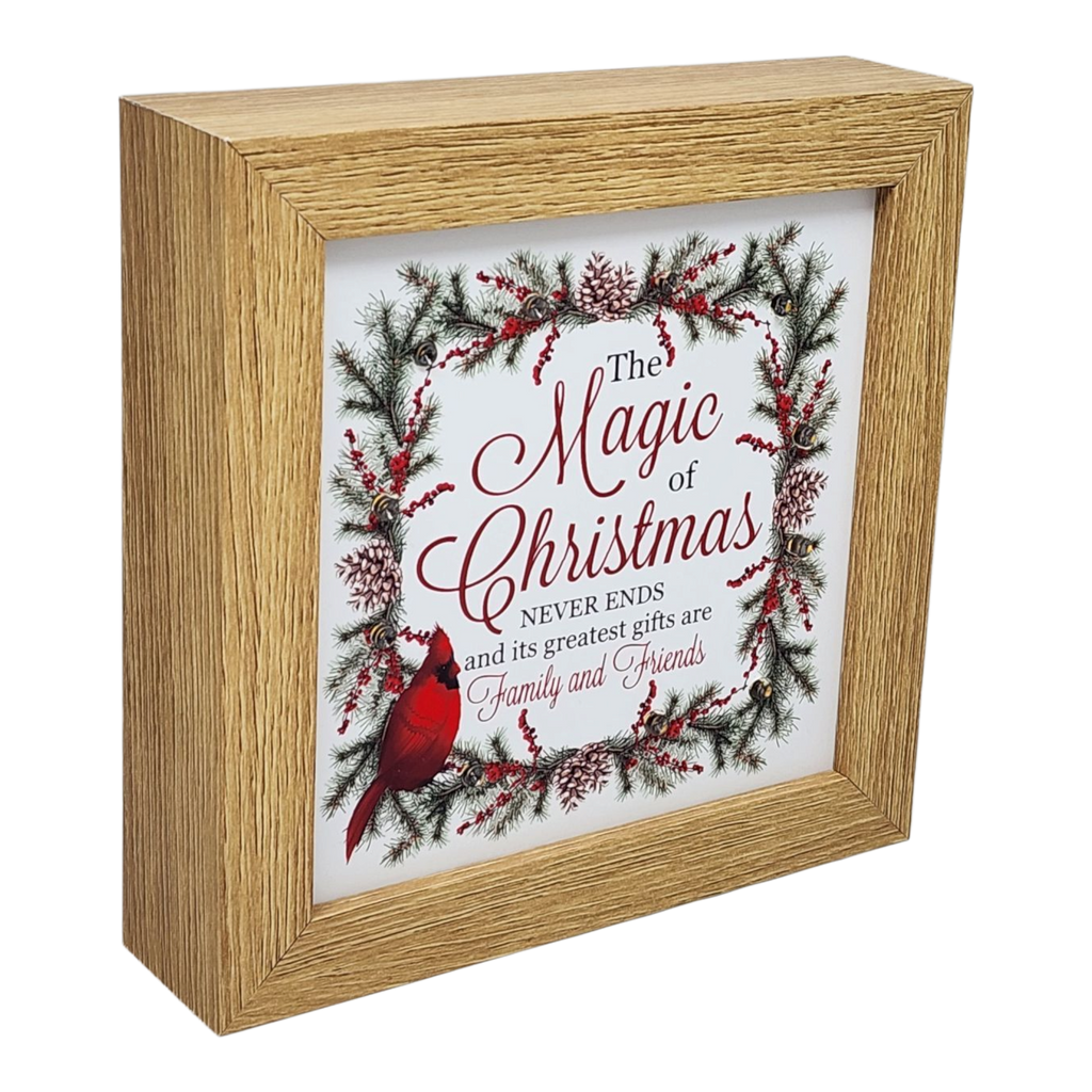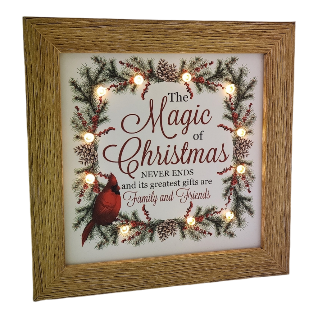 Bring a warm glow and heartfelt message to your holiday decor with our Lighted Magic of Christmas Frame. Standing a little over 6 inches high, this charming piece features a beautiful wreath adorned with pinecones, holly, and a vibrant red cardinal, all perfectly capturing the spirit of the season. Illuminated by soft, ambient lights, the inscription reads, "The Magic of Christmas NEVER ENDS and its greatest gifts are Family and Friends," reminding us of the true essence of the holidays.