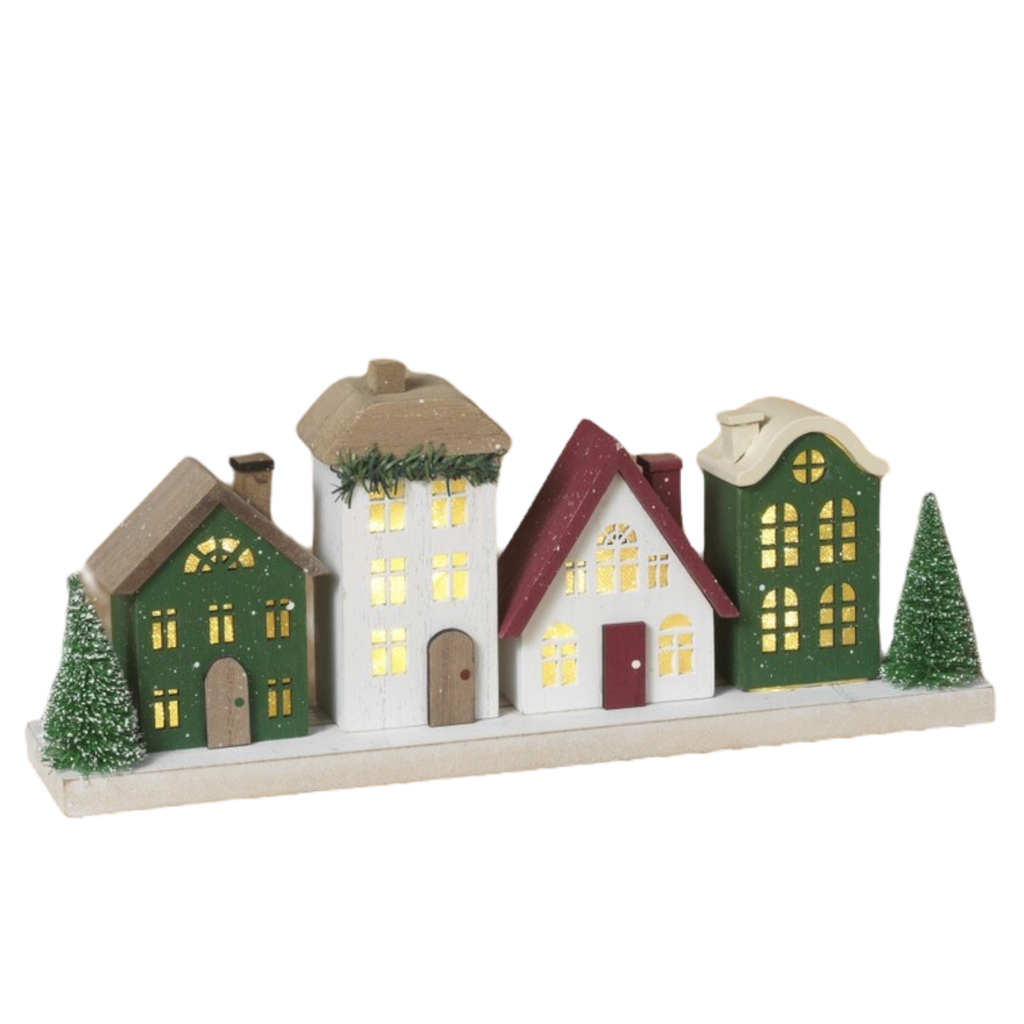 Bring the charm of a winter wonderland into your home with our delightful Lighted Holiday Village Scene! Measuring 12 inches long, 3 inches wide, and standing at 5 inches tall, this enchanting display features a picturesque collection of quaint houses adorned with festive details and charming architecture. Each house is beautifully crafted, showcasing an inviting array of colors and lights that create a warm and cozy atmosphere.