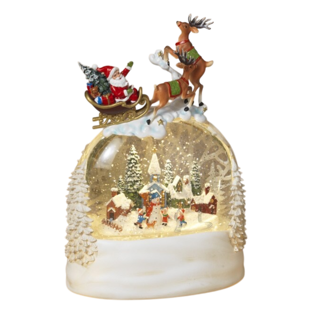 Capture the magic of the holiday season with our enchanting Lighted Spinning Water Globe with Sleigh! Standing at 9.5 inches tall, this captivating piece features a delightful scene of Santa and his reindeer soaring above a winter wonderland. The globe is beautifully detailed, showcasing charming snow-covered villages, playful children, and twinkling lights, all encased in a stunning glass dome that brings the holiday spirit to life.