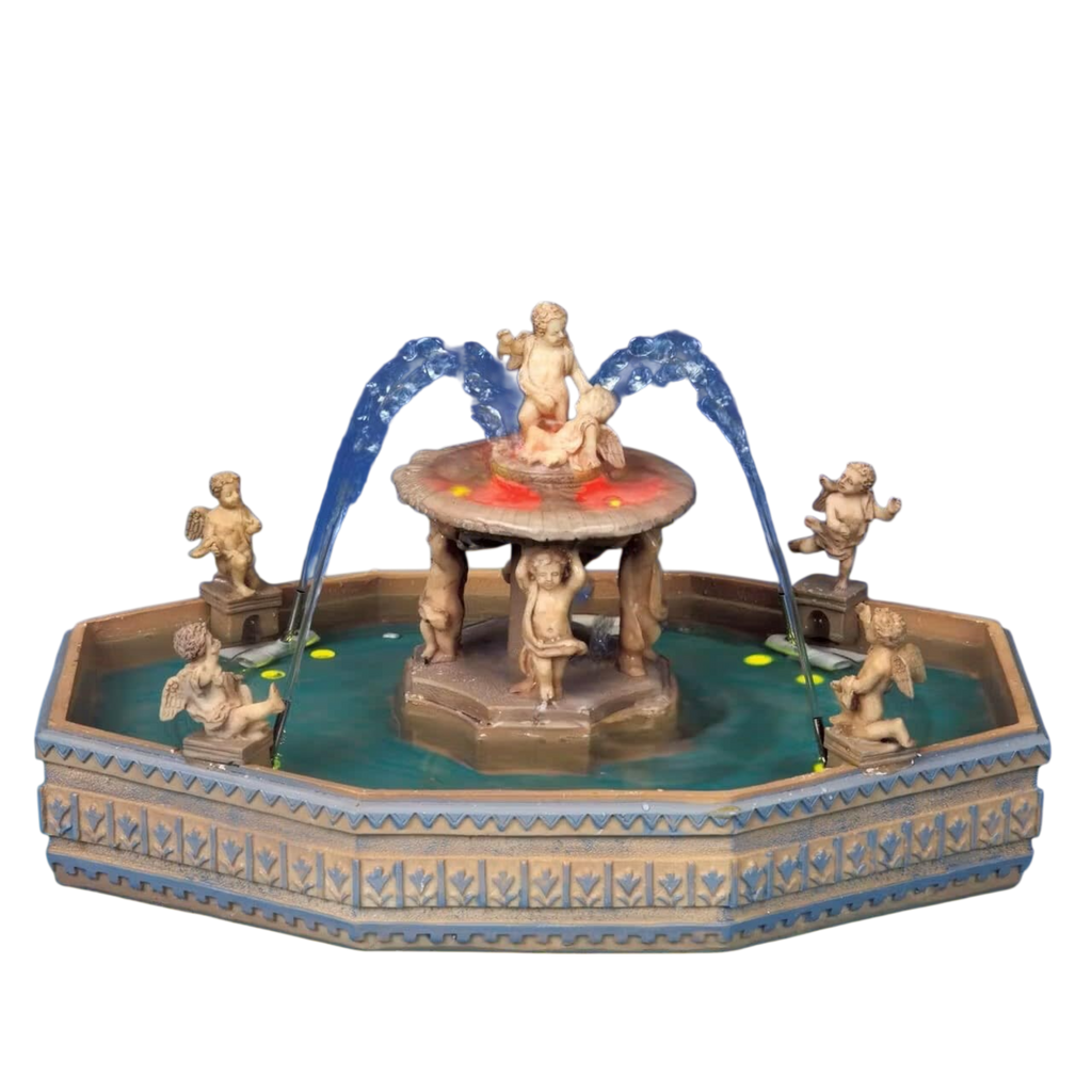 Introduce an elegant focal point to your holiday village with the stunning Lighted Village Square Fountain! This visually captivating piece showcases a beautifully designed fountain, complete with charming cherubs and gently flowing water, creating an atmosphere of tranquility and splendor. The intricate details of the figures and the vibrant water display add a magical touch to your festive setup, inviting admiration from all who see it.