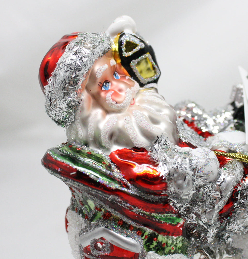 Introducing the limited edition Polar Flight Ornament. Santa holds up his lantern to see where he is going while his team of White reindeer pulls the sleigh. This piece stands apart from the rest all decked out with gem accents and a crystalized snow base.