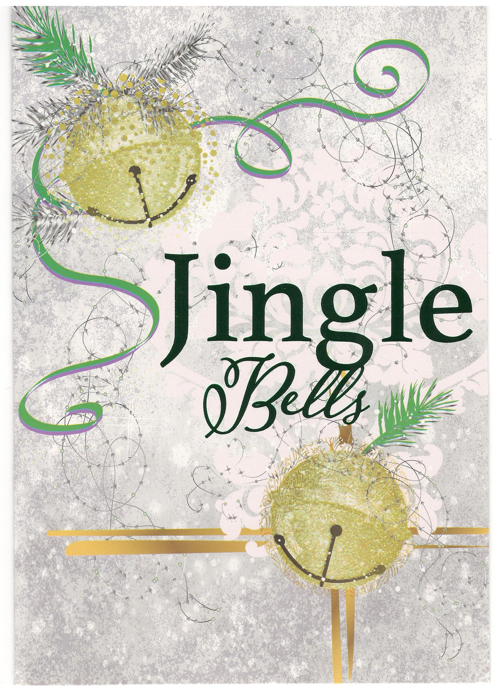 Ring in the holidays with our delightful set of 18 embossed holiday cards, each measuring 5.25 x 7.5 inches and featuring a festive "Jingle Bells" design. The whimsical illustration of golden bells adorned with sprigs of pine and a scroll of green ribbon captures the enchanting essence of the season. The playful yet elegant design, accented with touches of gold, adds a sparkle that makes your holiday greeting extra special.
