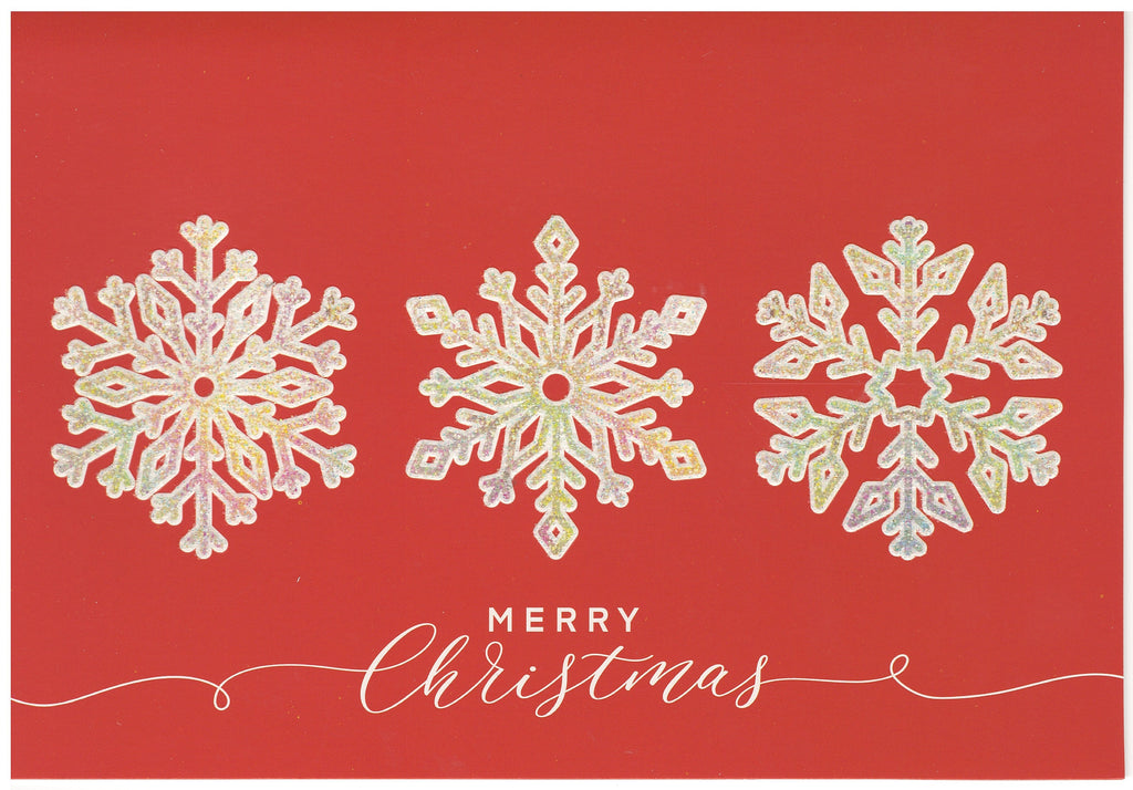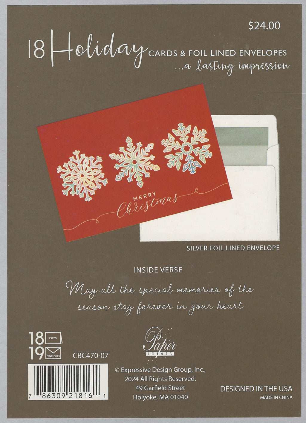 Celebrate the elegance of the holiday season with this stunning collection of 18 Christmas greeting cards, each an epitome of festive sophistication. The front of each card features three beautifully embossed and shimmering snowflakes against a striking red background, accompanied by the simple yet heartwarming message, "Merry Christmas." The design combines classic holiday symbols with modern elegance, making these cards perfect for spreading holiday cheer.