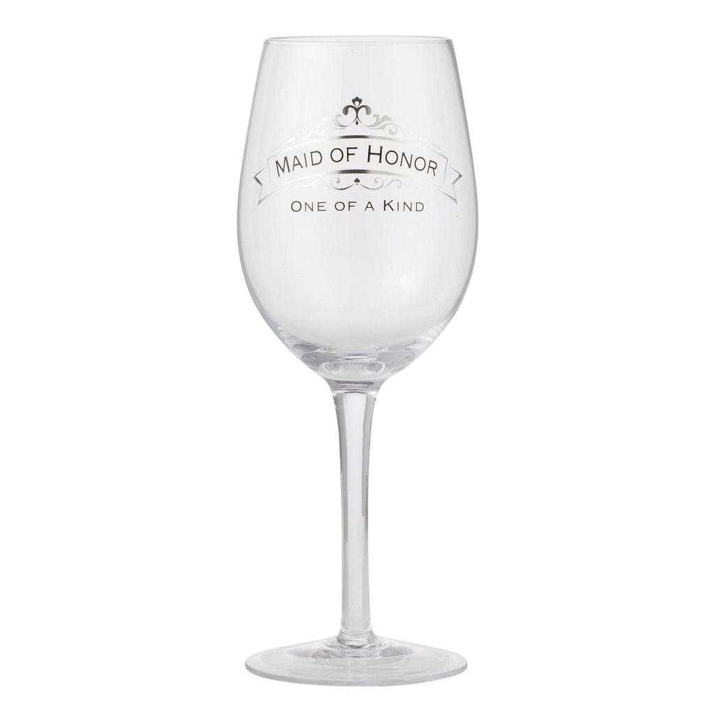 Browse the Complete Gifts & Holiday Collection This elegant Maid of Honor wine glass is mouth blown for superior clarity and shine. The intricate detail is done in a silver mirror finish. Handwash only. Glass is engravable.