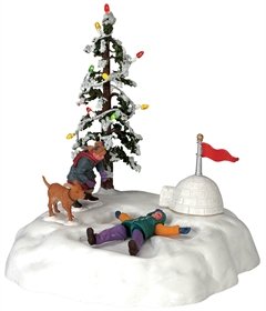 Browse the Complete Gifts & Holiday Collection This charming Christmas village scene features a beautifully lit tree adorned with festive lights, adding a warm glow to the winter setting. In the foreground, a character is delightfully making a snow angel, moving its arms and legs to create the familiar pattern in the snow. Nearby, another figure stands clad in cozy winter clothing, accompanied by a small deer. Adding to the whimsical atmosphere, an igloo with a red flag perched on top sits to the side, completing this enchanting winter wonderland.