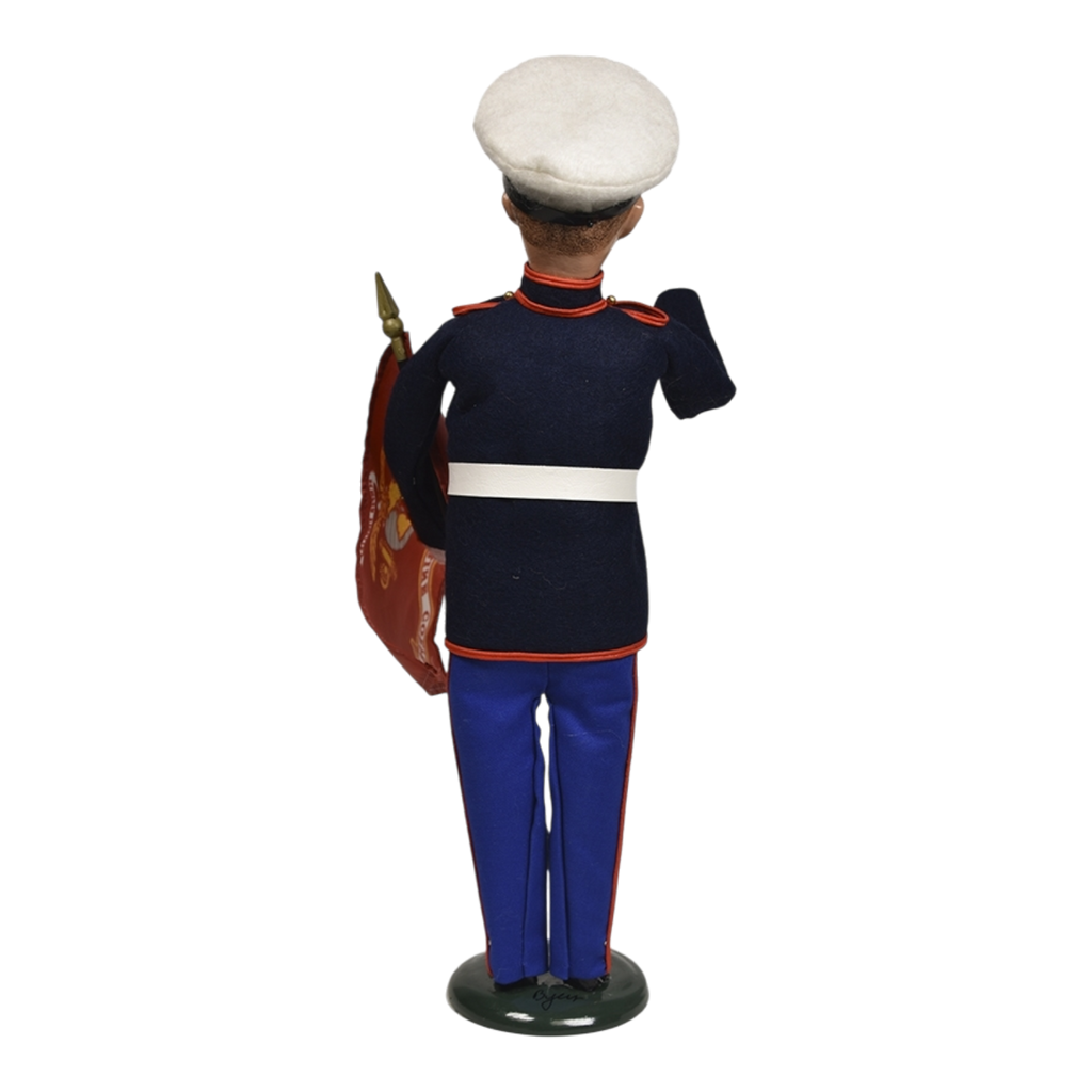 Celebrate the distinguished legacy of the U.S. Marine Corps with the remarkable Marine Man with Flag figure, standing proudly at just over 13 inches tall and meticulously crafted in the USA. This striking caroler is part of the Byers Choice collection commemorating an impressive 250 years of service in the Marines. Dressed in formal blues and saluting smartly with respect, he embodies the bravery, honor, and commitment of all those who serve in the Corps. The Marine Corps is renowned not only for its rich history but also for its relentless spirit, making this figure a true tribute to the men and women who wear the uniform.